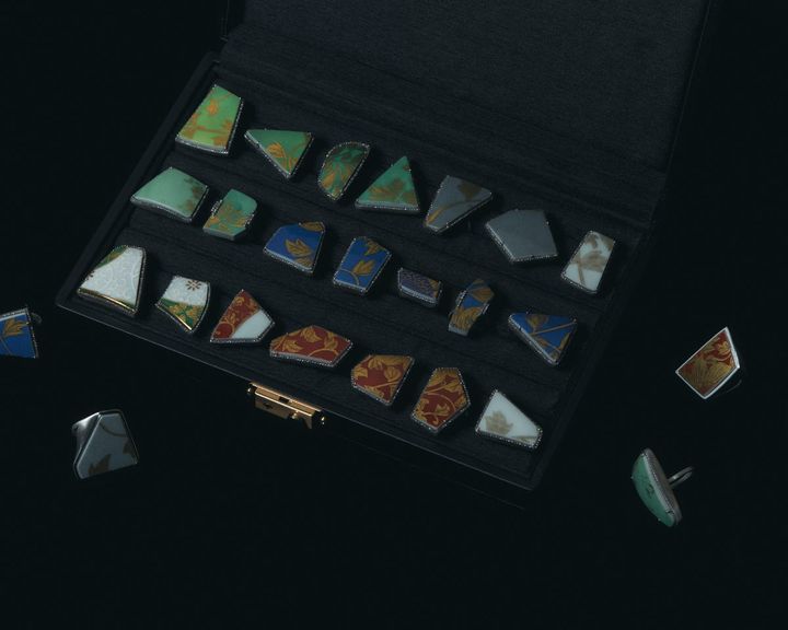 “地球上に既に存在する貴重な資源を活⽤する”を信念にものづくりをする「シャランポワ」 は、錦⼭窯とともに割れた陶⽚を唯⼀無⼆のファインジュエリーとして見事に昇華した。