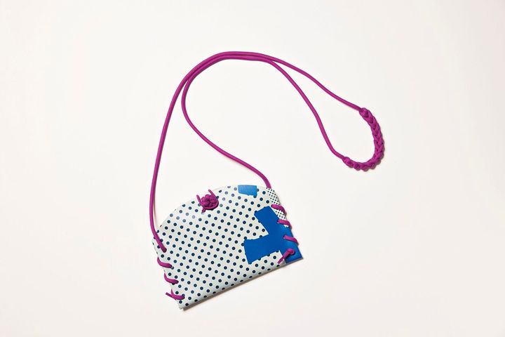 豊田市美術館の展覧会バナー(屋外幕)を円形にカットし、アップサイクルによって生まれ変わったミニサイズのバッグ。会期中に街の風景を彩っていたグラフィックをそのまま生かし、柄の出方がすべて異なる一点ものに。¥1,980/豊田市美術館ミュージアムショップ