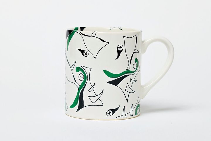 油画や彫刻だけでなく、家具やテキスタイルのデザインにも数多く取り組んだ岡本太郎。彼が手がけたテキスタイルの柄を全面にあしらったマグカップは、日常のひとときにささやかなアートの気配を添えてくれる。¥2,750/岡本太郎記念館ショップ