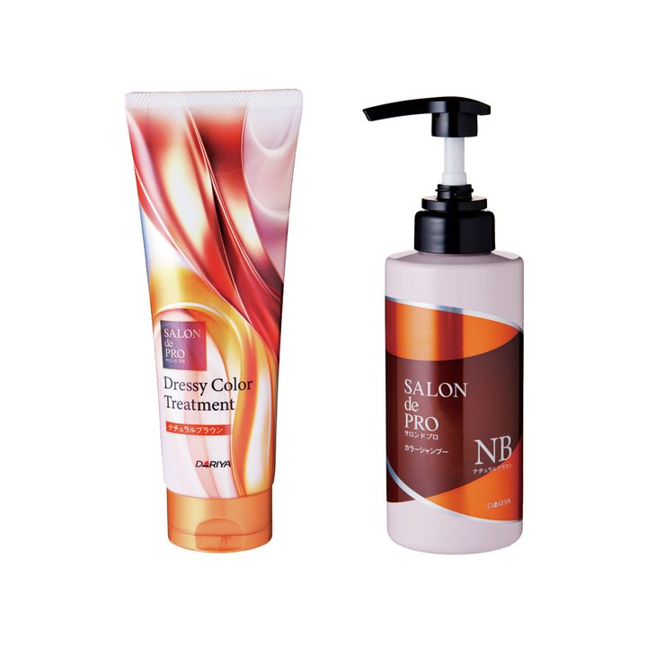 (左から)サロン ド プロ ドレッシーカラートリートメント〈ナチュラルブラウン〉 230g¥1,650、同 カラーシャンプー〈ナチュラルブラウン〉 300ml¥1,320[ともに編集部調べ](ともにダリヤ)