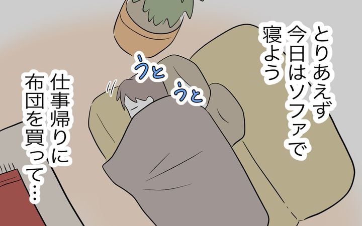 どうしても音が気になって眠ることができない優一。もう泣かれるのは嫌なため、今日はとりあえずソファで寝て、明日からは布団を買ってリビングで寝ようと心に決めたのでした。