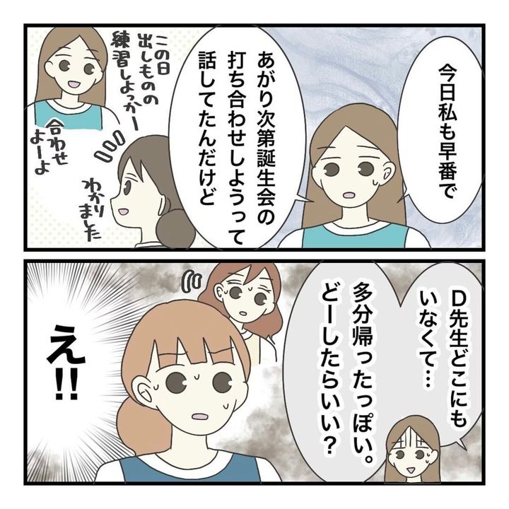 T先生がつわりでトイレに駆け込んだり、マスクをつけていることが納得できないD先生。そんな中、T先生のつわりがひどいため、しばらく9時出勤の固定勤務にすると主任から告げられました。