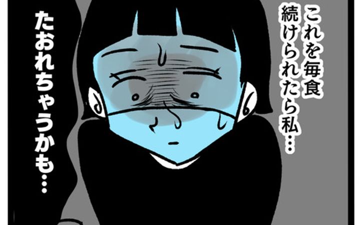 顆粒だしは使わないという持論を話す義母と「ごはん何杯でもいけちゃうよ〜!!」とガツガツ食べる夫の様子に、自信がなくなっていく栄美。さらに、水分がなければ食べられない料理を前に、「たおれちゃうかも…」と絶望してしまうのでした。