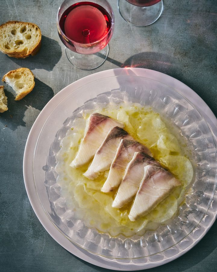 長谷川あかりさんの捻りの効いたおつまみレシピは、さっと作れて日々の晩酌に重宝するものばかり。和食の定番「ぶり大根」をアレンジしたカルパッチョは、シャキシャキの大根と脂ののったぶりを合わせ、濃いめのだしと味わうのがポイントだ。