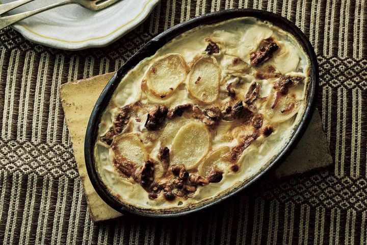 「エル・グルメNO.47」の特集「手軽に作れる、料理家の家飲みおつまみレシピ」の一品からランクイン。サルボ恭子さんが教えてくれたのは、生クリームで作るフランスの定番料理「じゃがいものグラタン」。くるみを加えることで、食感とナッティな香ばしさがプラスされ、ワインにもぴったり!