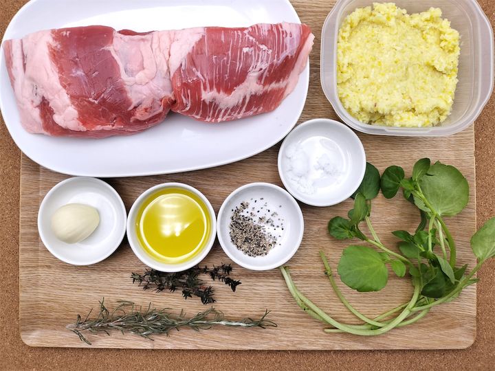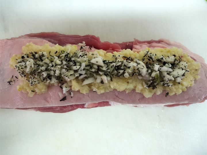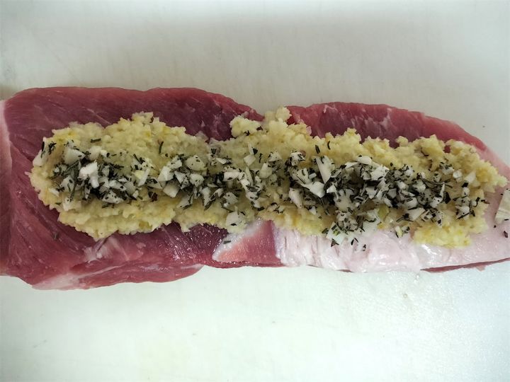 1. 豚肉を横半分に切って広げ、塩レモン、ハーブ類、にんにく半量をのせて広げます。
