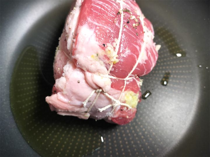 4. フライパンにオリーブオイルを引き、肉の表面に塩、黒こしょうを振って強火で全部の面を焼きます。