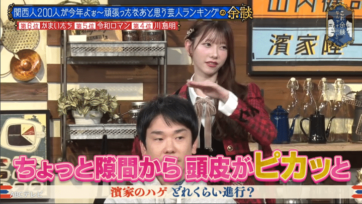 そんな中、濱家の頭をチラリと見た川島は、「今でもわからないですけどね」と話し、アシスタントのAKB48・千葉恵里に、濱家のハゲがどれくらい進行しているかを確かめるよう促した。濱家の後ろに立ち、頭頂部を見た千葉は、「ちょっと隙間から頭皮がピカッと」とコメント。すると川島は、「おなべの中からボワッとみたいに言いやがって」と絶妙なツッコミを。一同が「おなべの中からボワッとインチキおじさん登場。おどるポンポコリンの4番」と盛り上がると、濱家も「お笑い芸人登場じゃないよ」と乗っかった。
