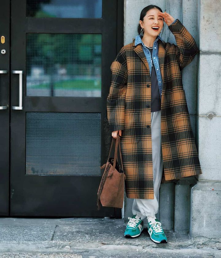 コート¥154,000(ハイク/ボウルズ)デニムジャケット¥20,900(アルページュストーリー)カットソー¥17,600(サードマガジン)パンツ¥49,500(ギャルリー・ヴィー/ギャルリー・ヴィー丸の内店)バッグ¥36,300(ヴィアメイルバッグ/ティースクエア プレスルーム)スニーカー¥16,500(アスファルト/フォーティーン ショールーム)ピアス¥10,450(ココシュニック オンキッチュ/ココシュニック)ネックレス¥12,100(Pearl for Life/ロードス)ソックス¥1,375(靴下屋/タビオ)
