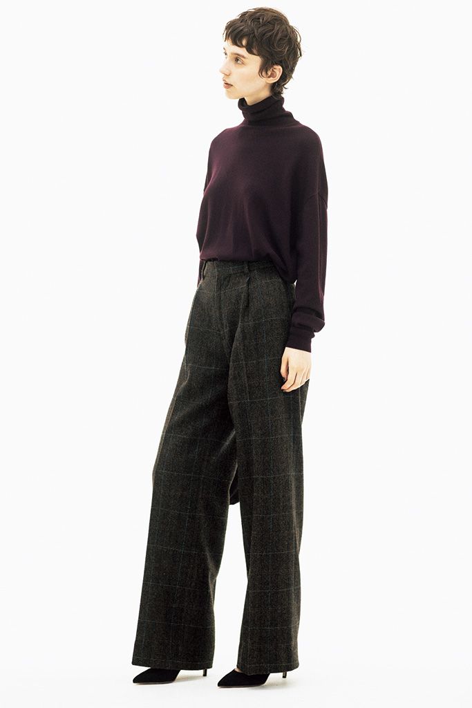 【POINT】タートルニットと合わせたトラッドな雰囲気に、多色づかいが適度なハズしとして有効。レディなバーガンディやピンヒールの足元など、要所に女性らしさを散りばめた丁寧なマニッシュスタイル。
