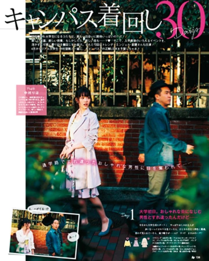 2018年4月号「中村里帆の恋がはじまる、かも…キャンパス着回し30Days」©高野友也