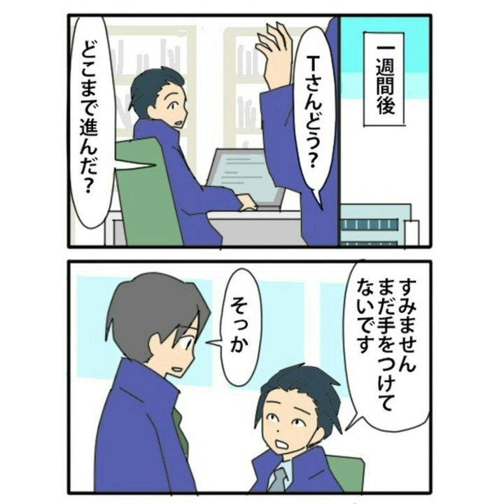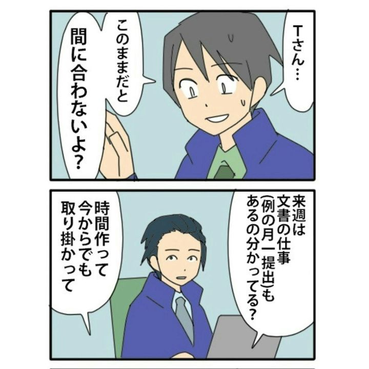先輩がTさんに進捗を確認すると、「まだ手をつけてない」と言われ、不安を覚えます…。