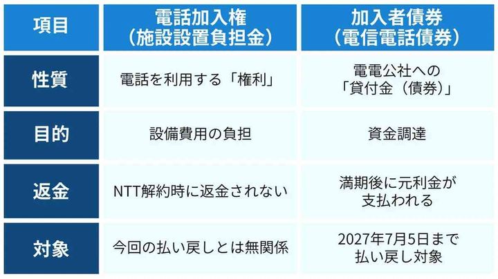 「NTTを解約すると電話加入権の72,000円が返ってくる」はデマですが、実際に現金化できる可能性があるのが「加入者等引受電信電話債券(加入者債券)」です。これは1953年から1983年にかけて電電公社が発行した債券で、NTTグループの特例措置により支払いが継続されてきましたが、2027年7月5日をもって終了します。