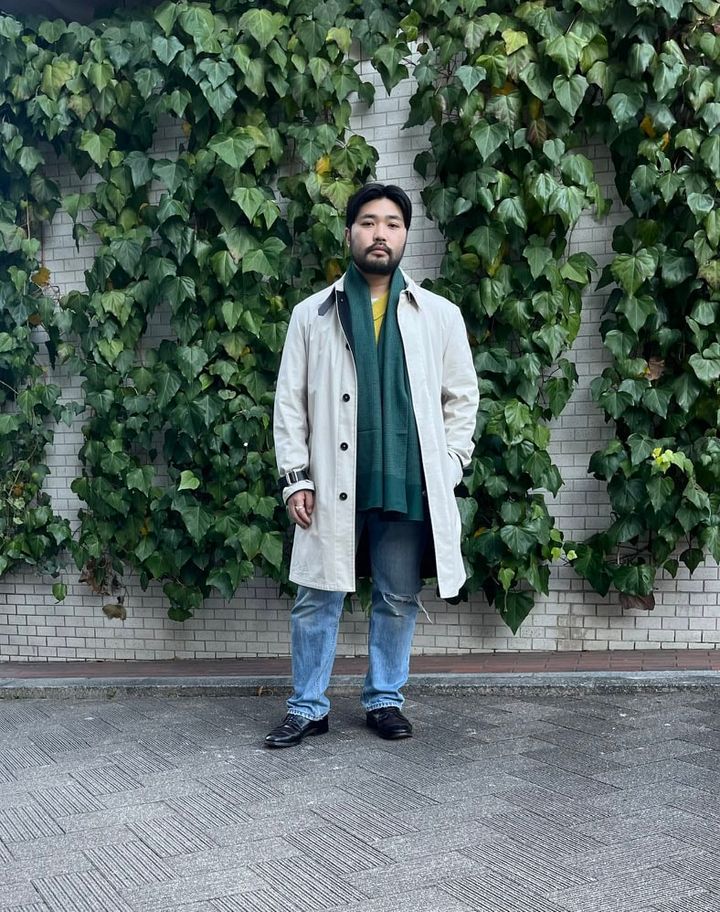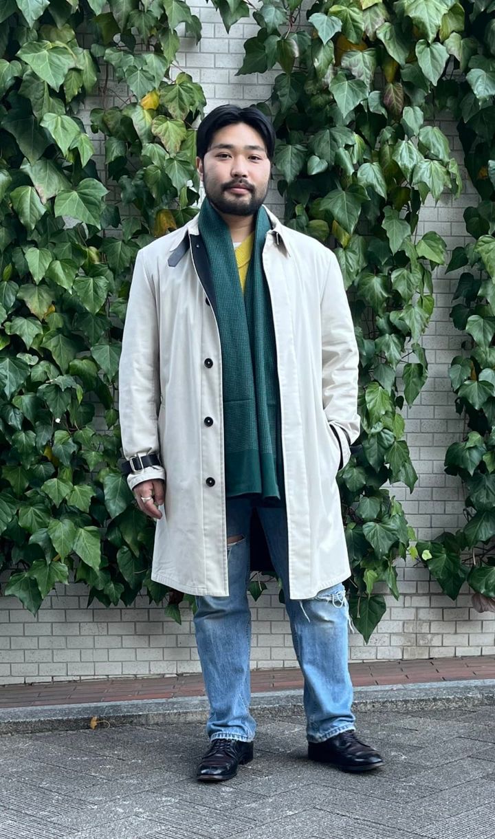 確かにメンズにしては、ずいぶんと華やかな色づかい。「冬はダークトーンが多くなってしまうので、あえて明るいトーンで仕上げてみました。グリーンとイエローという男性では珍しい配色なのですが、自分のキャラ的にはこのくらい遊んでもイイかなって(笑)。とはいえ、フェミニンになりたくなかったので、オールデンのシューズで男っぽさを、ダメージデニムでラフさをプラスしてみました。ちなみに防寒意識で取り入れたストールは首から垂らすことで、動作を加えるたびに優美に揺れてアクセントにもなるんです」