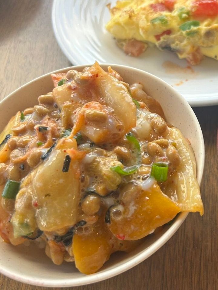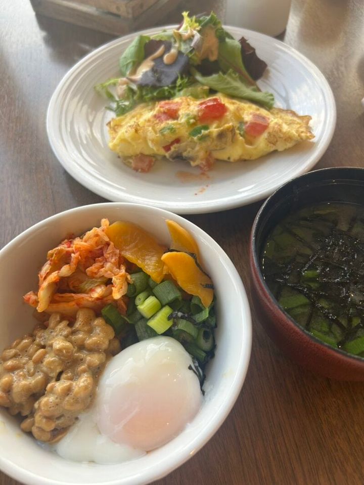 初日はノーマルな納豆ごはんだったのですが、連泊だったので毎日食べ方を工夫。最終的にお茶碗より大きなヨーグルトやシリアルを入れる器にごはんをよそって、上に納豆・キムチ・漬物・ネギと海苔(この2つは味噌汁コーナーから拝借)、温泉卵を乗せるオリジナル丼を完成させました! むしろ日本にいるときよりも発酵食品が取れていたかも(笑) 。