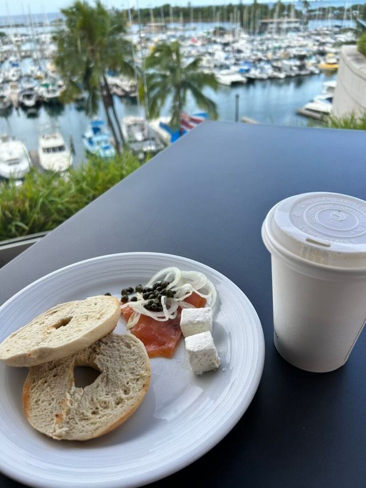 機内食から時間が経ち小腹が空いていたので、ハーバービューを眺めながら軽食を頂きました。