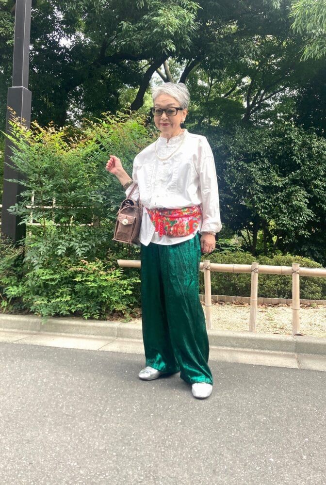 この日は素敵なあの人のイベントに参加していたきょうこばぁばさん。「イベントにお呼ばれしているので、華やかな場にはいつもアジアな感じのものを着るのでアジアンテイストでコーデを組みました。まずは15年位前に下北沢で購入したチャイナシャツを主役に、『SHEIN』のカンフースタイルやパンツを合わせてみました。カンフーパンツは私の夏の定番服なんです。昔はアジアンなデザインの洋服を買える店が多かったのですが、最近はネットで良く購入しています。靴は『GU』のメタリックのスニーカーを合わせました」
