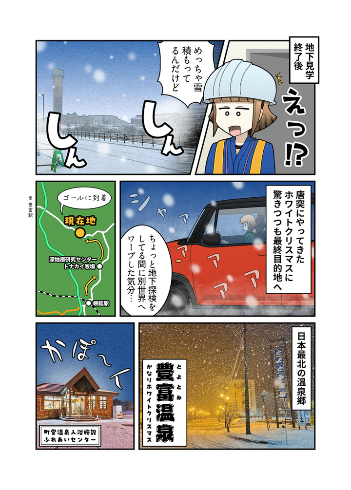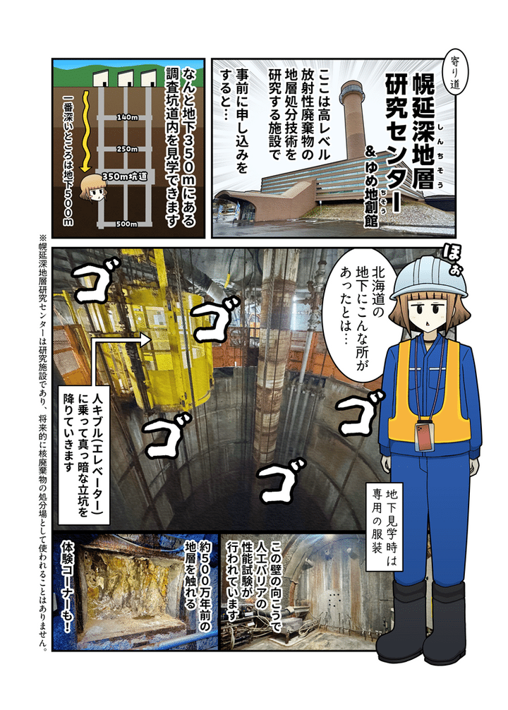 もうひとつの寄り道スポット「深地層研究センター」は、幌延町にある放射性廃棄物の地層処理研究施設です。目玉となる施設見学ツアーが平日に開催されるため予定を合わせるのに苦労しましたが、念願かなって地下350mの世界を体験できました。隣にあるトナカイ観光牧場もクリスマスドライブにピッタリですので、ぜひ一緒に立ち寄ってサンタ気分を味わってみてください。