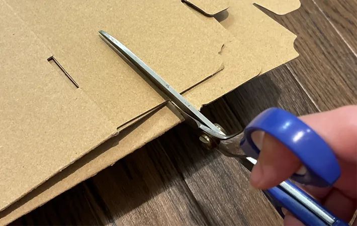 まずはハサミを用意して、ダンボールの両端に少し切り込みを入れます。