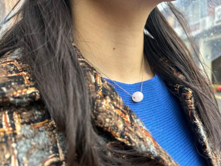 「大人世代になって、赤!や青!といった、はっきりした色合いが好きになってきました」。この日の青!のニットは、5年前にセミオーダーしたものだとか。アクセサリーは、10年ほど前の親友からの誕生日プレゼント。