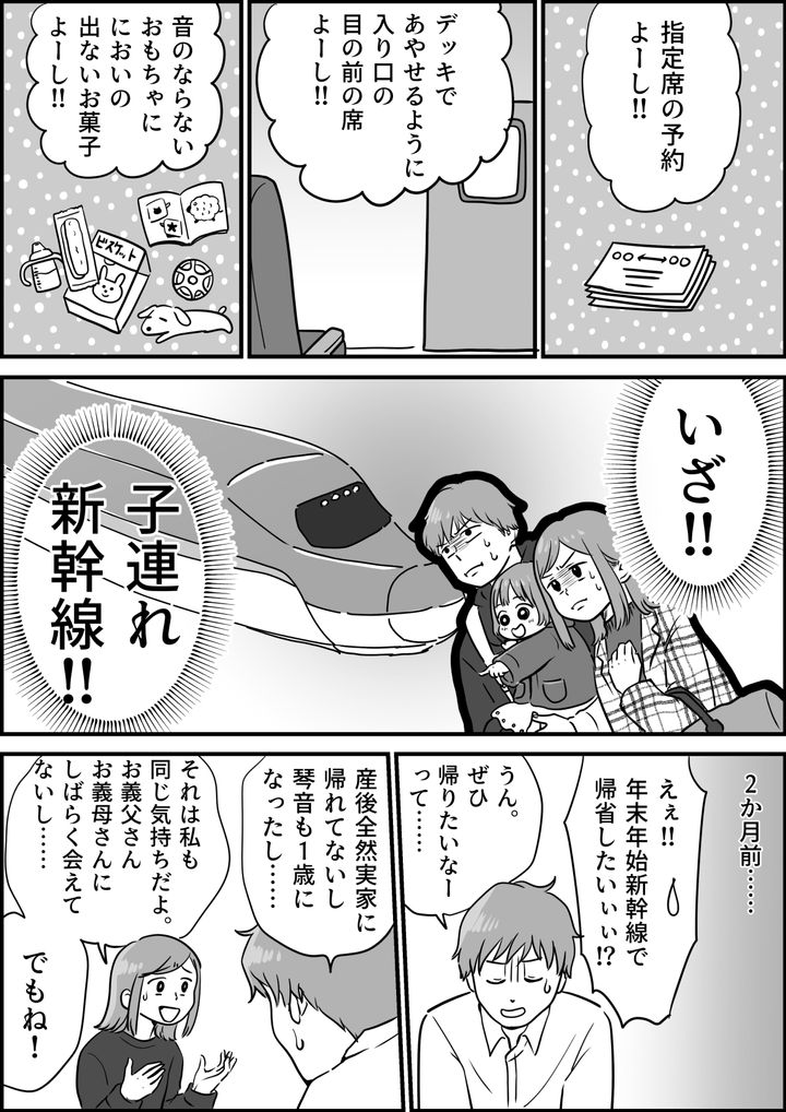 Bさん夫妻は、1歳の娘を連れて、夫の実家へはじめて帰省します。「指定席の予約」「デッキであやせる入口近くの席」「音の鳴らないおもちゃに、においの出ないお菓子」とできるだけの準備をしました。しかし普段10分の電車移動でさえ泣きわめく娘に、ママは「新幹線の2時間なんてムリでは……」と不安でいっぱいです。