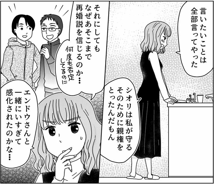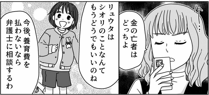 私がここまで話してもなお「本当は再婚して裕福になるんだろ。じゃ、やっぱり養育費の話をしようじゃないか」と、なぜか自信満々に言ってくるリュウタには呆れてしまいます。どうしてそこまでエンドウさんの話を信じてるのか……養育費はシオリの権利であり、リュウタの義務でもあるのです。勝手な思い込みでその義務が消えるわけがないのです。