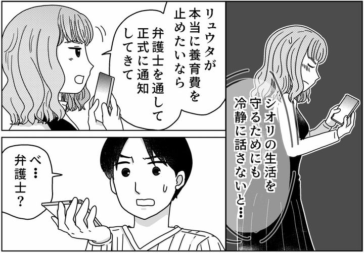 シオリのことを守るためにも、これ以上感情的になってはいけないと思いました。そしてあくまで冷静に……これ以上の話し合いには弁護士を立てて話し合いに応じるとリュウタに伝えたのです。すると、リュウタはたじろぎます。