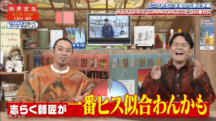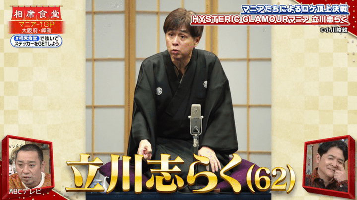 なお、志らくのロケVTRは、『相席食堂』12月23日放送回で公開された。同放送回では、毎年恒例の“もうひとつのM-1グランプリ”こと、マニアたちのロケ頂上決戦「MANIA-1グランプリ」の後半戦が開幕! ヒステリックグラマーマニア・志らくのほか、パンマニアと犬マニアがそれぞれ専門知識を活かしてロケに挑み、王者が決定した。