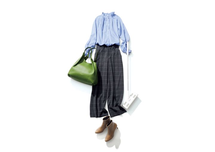 フリルネックブラウス¥2,290/GU パンツ¥9,990/ANYSIS(オンワード樫山) トートバッグ¥75,900/ジャンニ キアリーニ(ジャンニ キアリーニ 銀座店) ショートブーツ¥31,900/ダイアナ(ダイアナ 銀座本店)