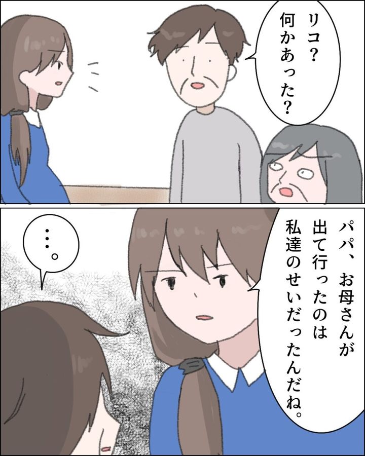 そこへ「リコ?何かあった?」とパパがやって来ました。私が「パパ、お母さんが出て行ったのは私達のせいだったんだね」と言うと、パパは言葉に詰まっていました。
