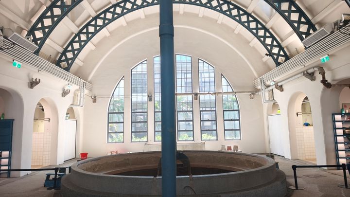 見どころの一つは、正面入り口の左手に位置する職員用の大浴場。中央にドーム形の高い天井をもつアール・デコの建築で、浴室両側には大きな半円形の美しい窓が見られます。丸い形の湯船は2つあり、北側の湯船からは湯気が出てくるという細かな演出もあって、見る者を飽きさせません。また、棚にはかつての職員の持ち物などが置かれ、往時の様子がリアルに再現されています。