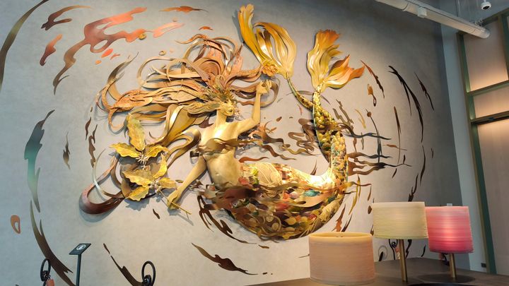 入り口にあるのは、スターバックスのシンボルマークであるマーメイドのオブジェ「閃耀女神」。これはアメリカ人デザイナーがラフを描き、台湾人の彫金作家が制作したもの。手には梅の花を持ち、腰には柿があしらわれ、尾っぽは台湾固有種のヤマムスメをモチーフにしています。さりげなく郷土の要素が取り入れられているのが素敵ですね。