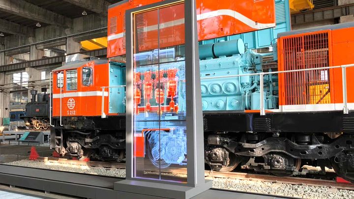 機関車の部品が展示されているほか、ディーゼル機関車のエンジンカバーをつり上げ、スライド式大型モニターを組み合わせて内部構造を紹介するというユニークな展示もあります。機械やモーターの動作音をアレンジした楽曲とともに、移動モニターが内部の様子や動力の仕組みを映し出します。鉄道に詳しくない人でも、直感的にイメージできる仕掛けが好評です。