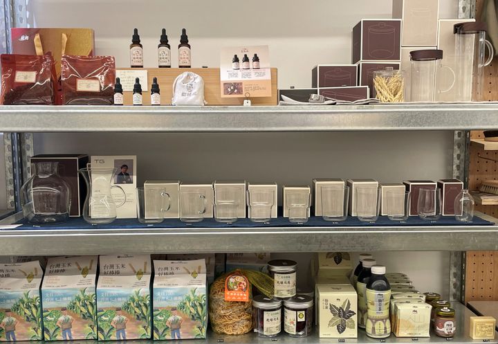 厳選された食品が並ぶコーナー。食品以外に、台湾ガラスのブランド「TG」のコップも販売。初出:2025年6月21日