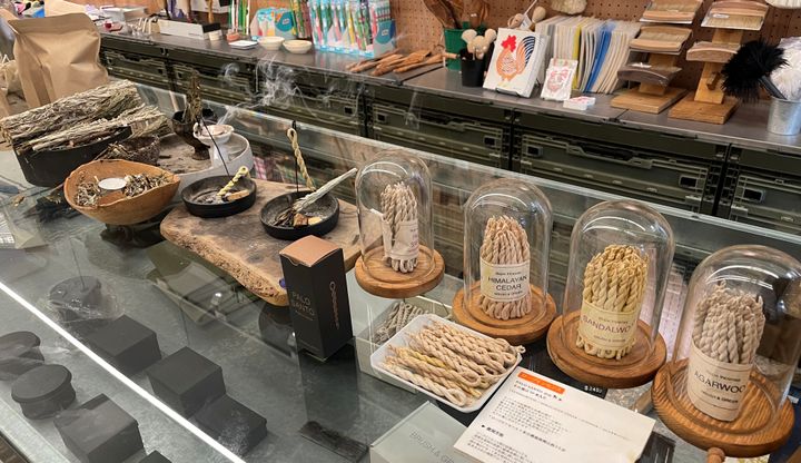 特に「香り」に関する商品はバラエティに富んでいます。なかでも、オリジナルのインセンス(お香)が充実。ペルーの聖なる木・パロサントの香りがするネパール製のロープ形インセンスや、木造家屋を解体した際に出る廃材を原料にしたヒノキのコーン形インセンスもあります。店内ではお香が焚かれているので、いい香りに包まれながらショッピングが楽しめます。