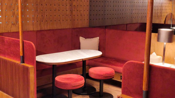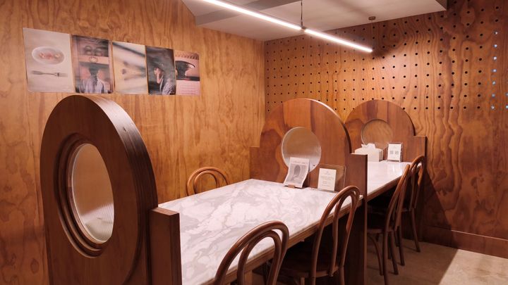 昭和レトロな喫茶店のような試食スペース。初出:2025年8月7日