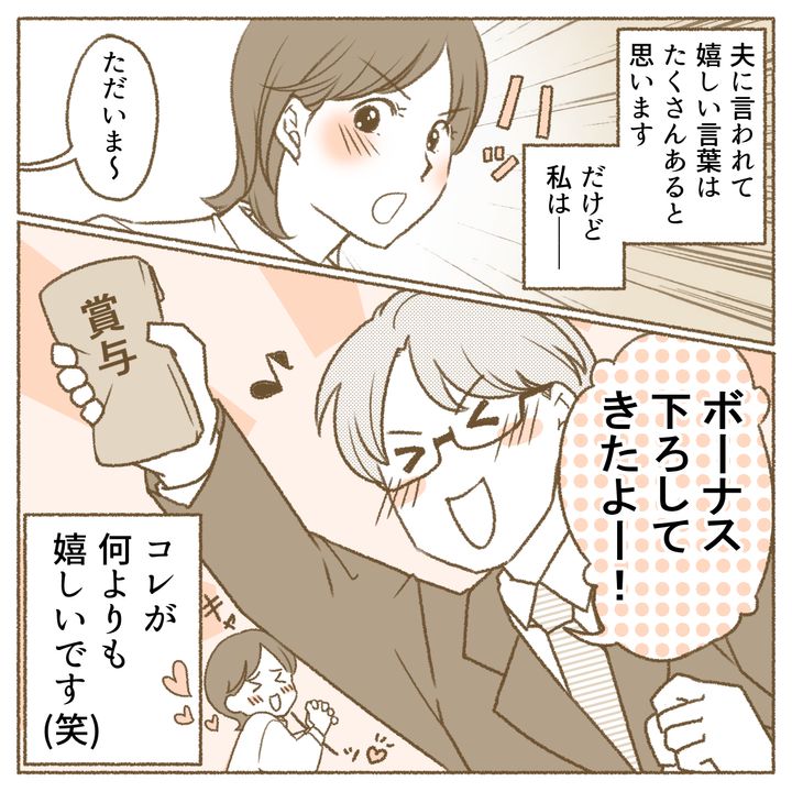 ああ……これはいい、とてもいい言葉ですね! すっばらしいひとことです。しかしコレ、誤解が生じないようにしたいですよね。夫の言葉が嬉しいのか、夫がおろして持ち帰った現金が……。おっと、コレくらいにしておきましょうか(笑)。幸せなおふたりのエピソードに水を差してはいけませんね。これからもボーナスが支給されるたびに、ハッピーを上書きしていっていただきたいものです。