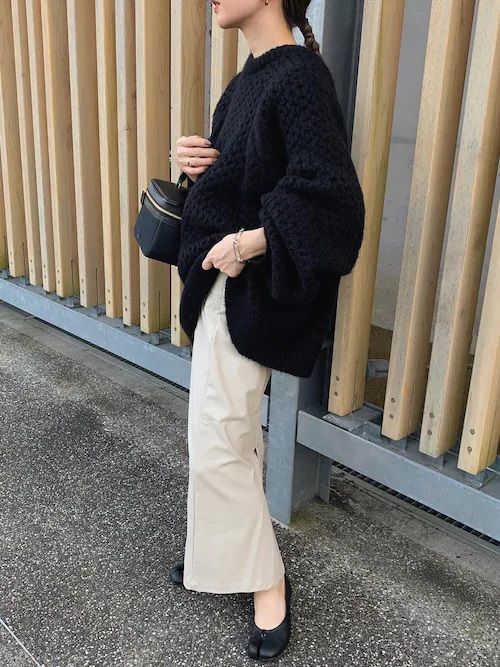 下半身に白を持ってくると「膨張して見える、太って見える」と気にされる方も多いのですが、冬のボトムスはボディラインを拾いにくい素材やデザインも多いので、夏より取り入れやすいという一面も。また、お腹やヒップまわりが気になる場合も、冬なら大きめのトップスで自然にカバーできるのでおすすめです。