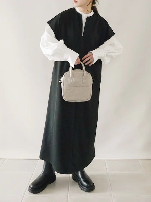 一枚持っておくと便利なのが、ブラックのワンピース。身頃や首元、腕まわりにゆとりがあり、レイヤードしやすいデザインのワンピースを持っておくと、さまざまなコーディネートに着まわせて便利です。特にスカート丈はロング丈のものを選ぶと、カジュアルにもドレッシーにも仕上げられて優秀。コーディネートの幅を広げてくれます。