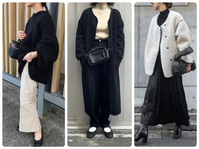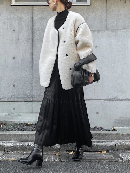 もこもことしたボア素材のアウターやボリュームのあるニットカーディガンなど、冬の白いアウターには可愛いデザインのものが多いですよね。「着ぶくれしそう」と心配される方も多いですが、モノトーンで統一するとすっきり、洗練された印象に。