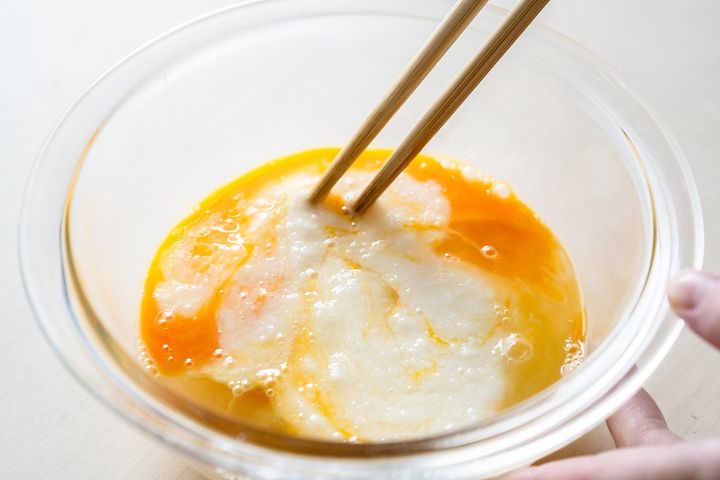 4. 長芋をすりおろし、卵を割り入れて軽く混ぜ、とろろ卵を作る。