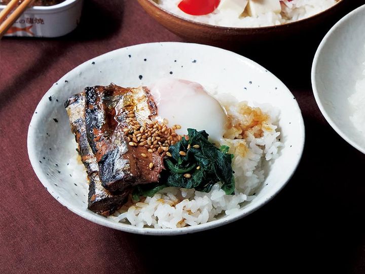 ❶ さんまの蒲焼を汁ごとご飯に盛り付ける。