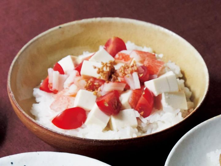 ❷ 1/4に切ったミニトマトとさいの目切りにした豆腐をのせる。