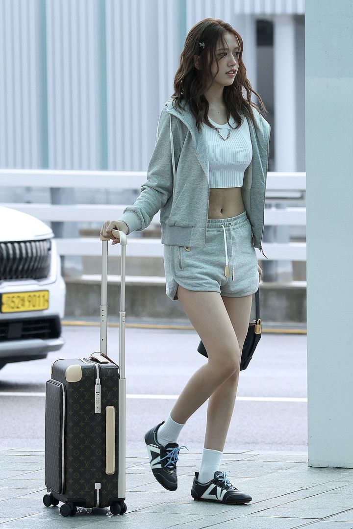 旅先の定番アイテムでもあるパーカは、ワンマイルコーデに見えないようなショート丈やコンパクトなシルエットを選ぶのがポイントに。IVEのリーダー、アン・ユジンはショーツを合わせて、カジュアルなセットアップを楽しんでいた。肌見せやスニーカー選びで、よりスポーティな雰囲気に仕上げているのが◎。