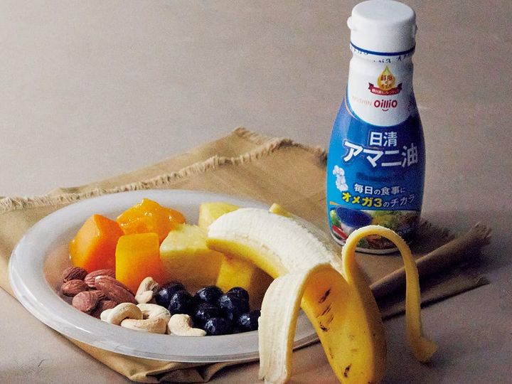 ❸ グラスに注いだらアマ二油を少量垂らす。お好みで砕いたナッツをトッピングするのも◎。