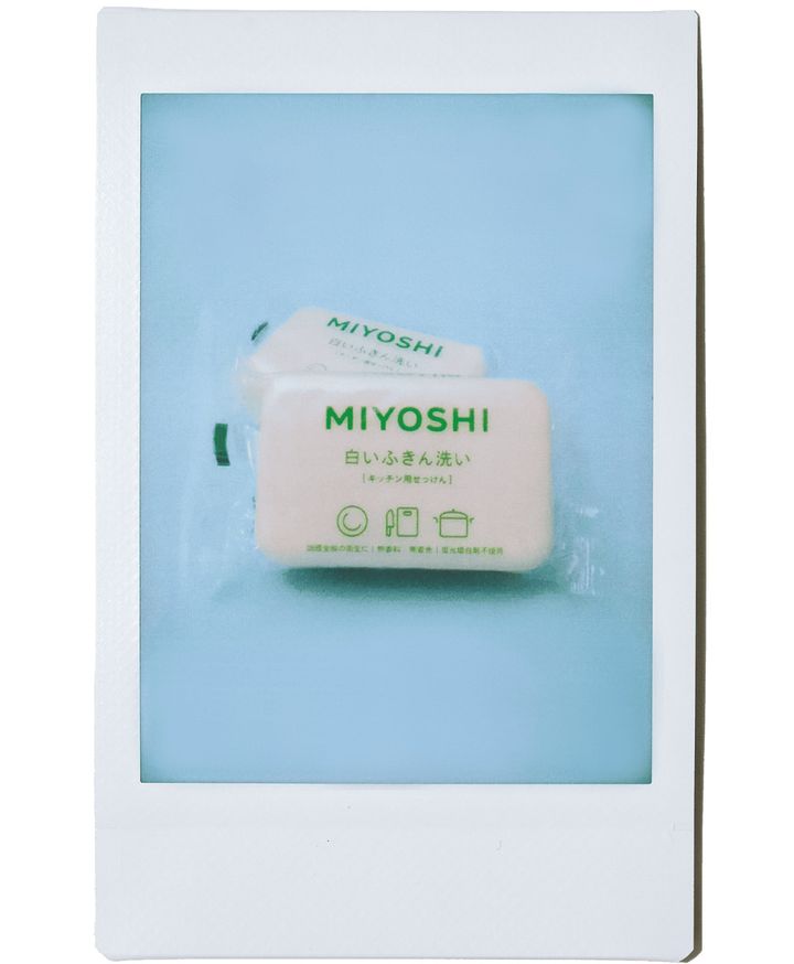 手肌にやさしい〈MIYOSHI〉の定番アイテムのひとつ、ふきんや食器などに使う台所用固形石けん。洗浄成分は、石けん由来の弱アルカリ性で、油汚れなどの酸性汚れをすっきり落とす。無香料・無着色なので、香り移りを気にせず、子どもの食事まわりのアイテムにも使いやすいのが特長。