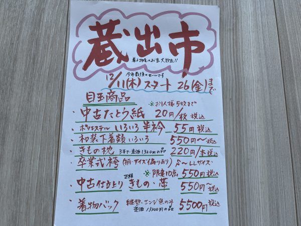 着る物やさんでは、様々なセールを開催。取材に訪れた12月は、在庫一掃「歳末蔵出市」を行っておられました。