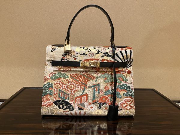 お友達は、お母さまが結婚式の時に締められた丸帯を、素敵なケリーバッグ風のカバンにリメイクしました。 着物地なので軽く、どこに持って行ってもほめられるそうです!
