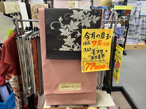 たとえば今月の目玉品。限定7反企画。洗える着物+正絹名古屋帯 2点セット。お仕立て代付きでなんと77,000円!!