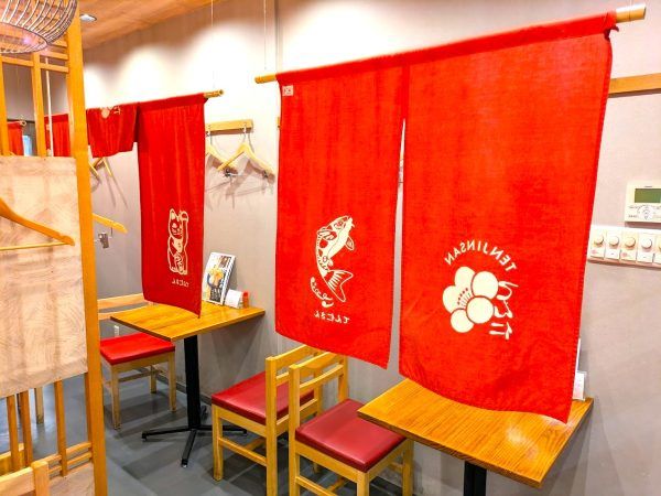 店内は、赤い暖簾が目隠しをしてあります。いいですね~。木の温もりと明るい雰囲気の中で楽しめるテーブル席と、